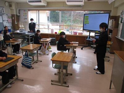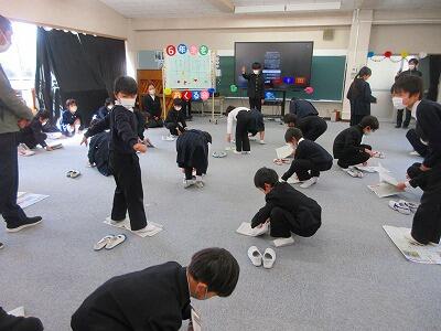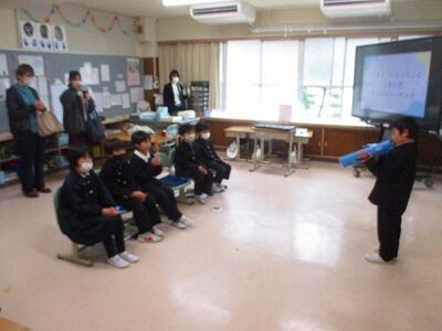 1年生は、6年生クイズをしたり、ランドセルを使って、卒業を祝う言葉を送ったりしました。