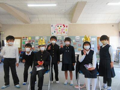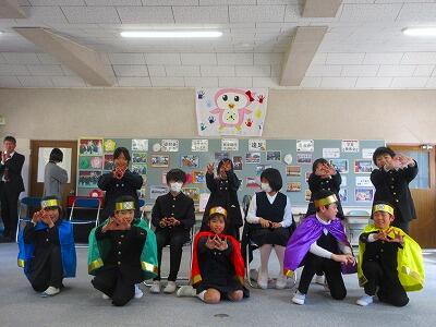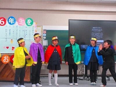 学習発表会、豊永ふれあいサロンに続いて登場した親切戦隊3・4ネンジャーが、中学校に進学する6年生に励ましの言葉を送りました。