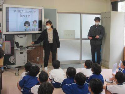 藤野先生の質問に子ども達は、聞き取った言葉を答えたり、挿絵を指さしたりしていました。