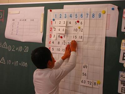 マス計算表に数字を貼り、五感を使ってかけ算の考え方を見つけていきます。